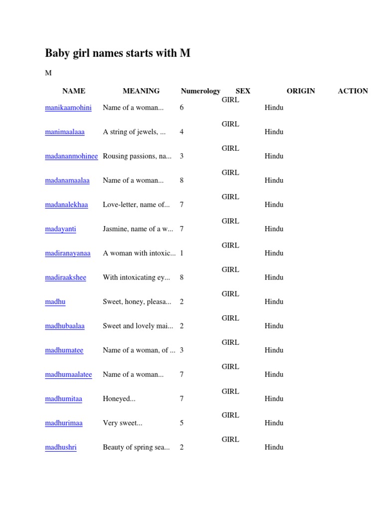 Unique baby girl names starting with m maata through madhuri. Browse the list of top 100 cute names including marie and michelle. If you are looking for the trendiest and popular girl names below are some of the girl names that stat with m that are rising in popularity in the us.
